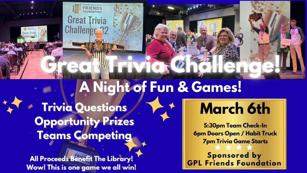 Competition will be fierce as teams representing local businesses, service groups and friend/family groups battle it out to be crowned Trivia Champion. As a fan, you can have a front row seat to all the action while enjoying The Habit Truck and a dessert buffet. With all proceeds benefitting the Glendora Public Library this is one game where the entire community wins. To sign up your team or to purchase tickets to sit in the stands and cheer for your favs: click here Trivia Challenge 34 or scan QR code